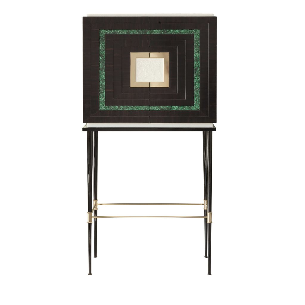 The magnificent Ebony Bar Cabinet will be a precious addition to a living room and an ideal place to store bottles, glasses, and other necessities to serve drinks. The structure in black nickel features tall and slender legs connected with brass elements and supporting a short cabinet in ebony whose front boasts geometric decorations in malachite stone and Estremoz marble. The handles are in frosted, engraved, and chiseled glass, while the interior is upholstered in fabric and features a mirror and a light in the back.