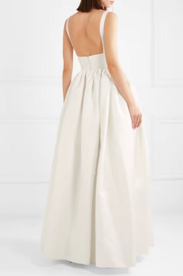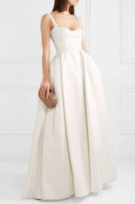If you prefer a dress with a little less decolletage, you’ll certainly feel love-struck in this creation. The gossamer floral, embroidered organza is whimsical and romantic and the style, while offering a high neck is still somewhat seductive. Even Eloise Bridgerton wouldn’t be able to argue with this dress!