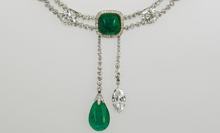 This magnificent necklace is the ‘Delhi Durbar’ piece inherited by Her Majesty, Queen Elizabeth ll from her grandmother, Queen Mary, and as the court jeweler rightly said, “it makes you green with envy”! Never mind the court jeweler, right now, and as I have in the past, I drool green whenever I see this and the other pieces in this particular collection. What continues to impact is the endless jewels that came to the Queen’s collection from India, a jewel in the Commonwealth’s crown, before its independence. However, the ‘Delhi Durbar’ collection was designed for Queen Mary to wear to the December ‘Durbar’ in 1911 in Delhi, the last ‘Durbar’ held under the monarchy. Thus giving the collection its name.