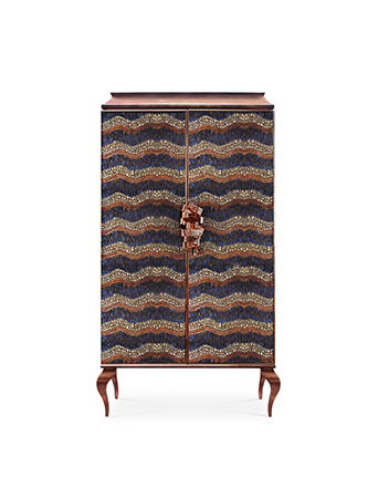 Designed passionately and exquisitely by the incomparable talents powering KOKET, the Camilia Armoire was created to grace the most regal of dining rooms with its elegance and splendor. Inspired by the aristocratic palaces of the Alexandrian pashas of Egypt, an artisan hand-carved peacock, meticulously engraved and delicately finished in metal leaf, crowns the mother of pearl of the luxury wardrobe.