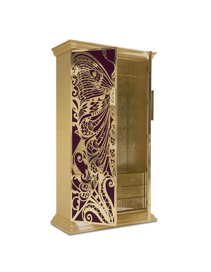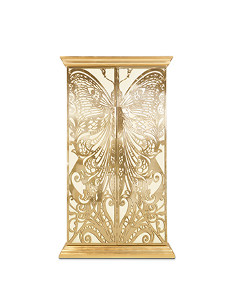 Designed with a profound admiration and influence of the French decorative arts, the Mademoiselle Armoire will transport you to another world in a crazy beautiful kind of way. The filigree metal butterfly doors are backed by decadent fabric and open to a metal leaf interior covered in a high-gloss varnish with nine antique mirror drawers and two adjustable glass shelves. Further, you can pick your favorite color for the doors for your own custom styling.