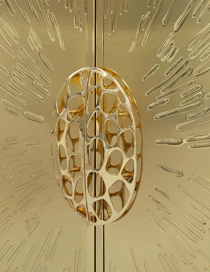 There is a sense of reveal and conceal as KOKET takes a beautiful armoire in high gloss lacquer and adorns it in metal organic lace, revealing a mesmerizing hint of what lies beneath. The stunning interior opens to an antique mirror back with two glass shelves. Then, beneath sit, four drawers embellished with organic hardware finished to match the exterior. Prefer a color other than black? The piece is available in pretty much any color you can imagine, so you’re in luck!