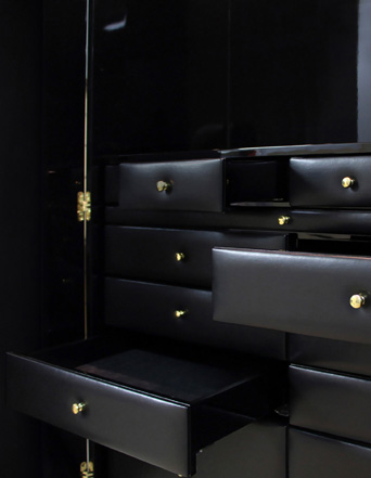 Fall under the spell of the City of Love with the luxury Parisian Armoire. Reminiscent of the magical doors that line the charming streets of Paris, the large ornate doors are adorned with gold, sinful serpent handles. Then inside, glorious fabric lines the piece’s thirteen lacquered drawers.