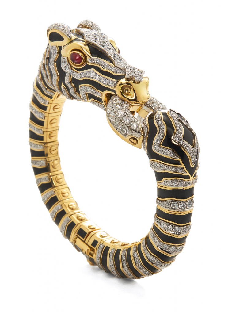 Haute of Desire, the Diamond Zebra Bracelet is a brilliant work of art for the most decadent women. The Want and Need of all who admire the beauty of the animal kingdom. Apogee of artistry at the hands of American jeweler David Webb—lover of animal motifs and enamel patterns. Born in NC, David reinvented the craft of wearable art during his 50 years, a life lost too soon to cancer. Radiating individualism and freedom, the Zebra also appears iconically in the brand’s logo. Seen in Vogue in 1964, just a year after its debut, today, the original bracelet is in MoMA’s permanent collection. With its cabochon ruby eyes and 30+ hours of hand craftsmanship, Diana Vreeland, Elizabeth Taylor, and Jackie Kennedy all wore this stunning bracelet, bringing up its iconic status. Want one? Today you can order the bracelet handmade by the son of the original craftsman.