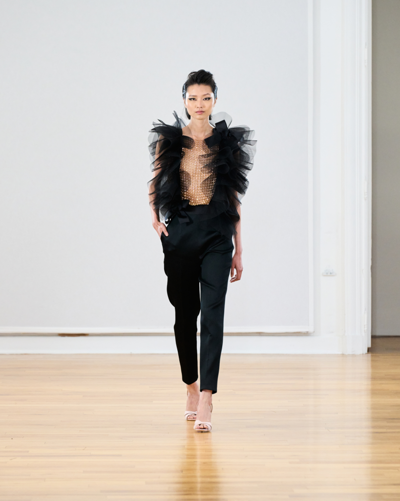 It was supposed to be with a slim skirt, but somehow, I changed my mind as I saw more of a modern tuxedo than a classical look. But I was still hesitant about where to place this look in the line-up of the collection. Then, when we did the casting for the models, this girl pulled this look so well; she had the look, attitude, and character. We all saw that it would be the perfect opener for the show. Glad we did, too, as it was very well received by the press, celebrities, and clients.”