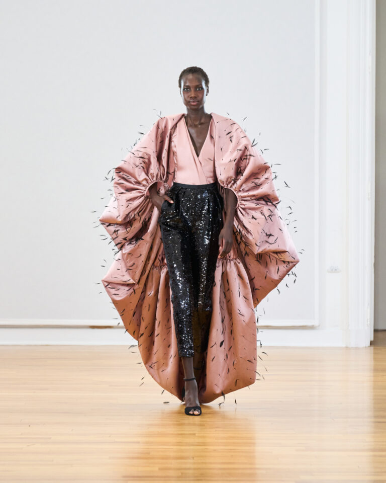 “This look really surprised me; it took the lead instead of me. I started in a completely different direction. I wasn’t very convinced on paper, so I started working with the fabric on a mannequin. Very resilient fabric, hard to tame, but I love the volume and construction that it gives. I added the feathers to give light ornament and a sense of movement.