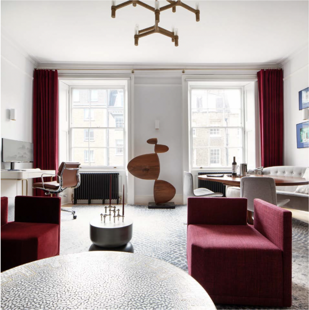 Finally, accentuating the space between the room’s large windows is a hand-carved wood sculpture by UK artist Nicholas Shurey who is based in Copenhagen.