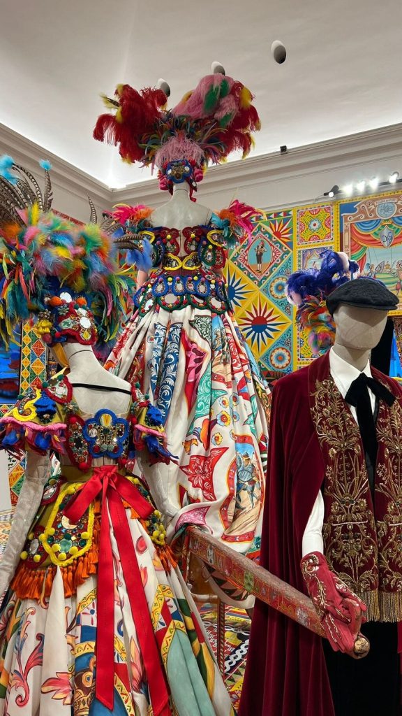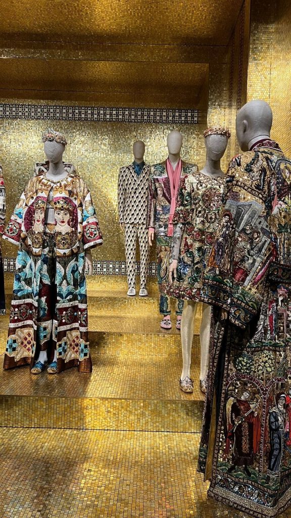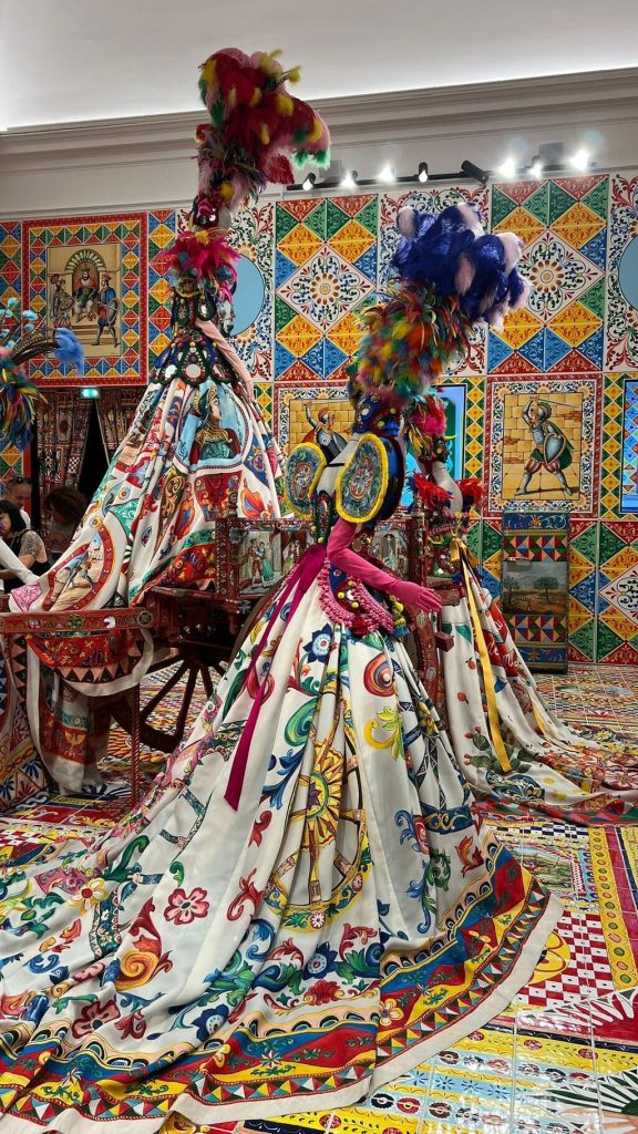 This folkloric room celebrates the heart of Sicily—a cornerstone of Dolce & Gabbana’s identity. Alta Moda dresses mirror the vivid ceramics of Caltagirone and the storytelling spirit of Sicilian carts, puppet theatres, and saints. It’s a vibrant tapestry of narrative, nostalgia, and artistry.