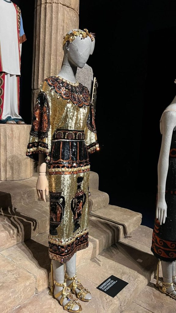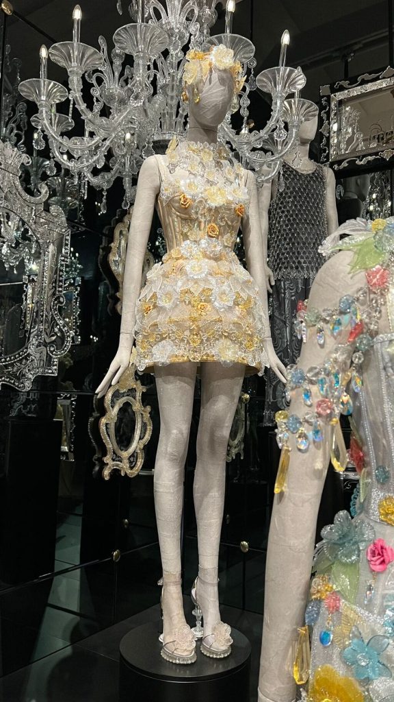 A gold macramé gown closes the exhibition in tribute to Milan, birthplace of Dolce & Gabbana’s handcrafted Alta Moda. Nearby, a theatrical tableau honors opera—Italy’s ultimate expression of beauty and passion—where fashion and fantasy mingle, capturing the designers’ belief in life as a stage and couture as its most magical act.